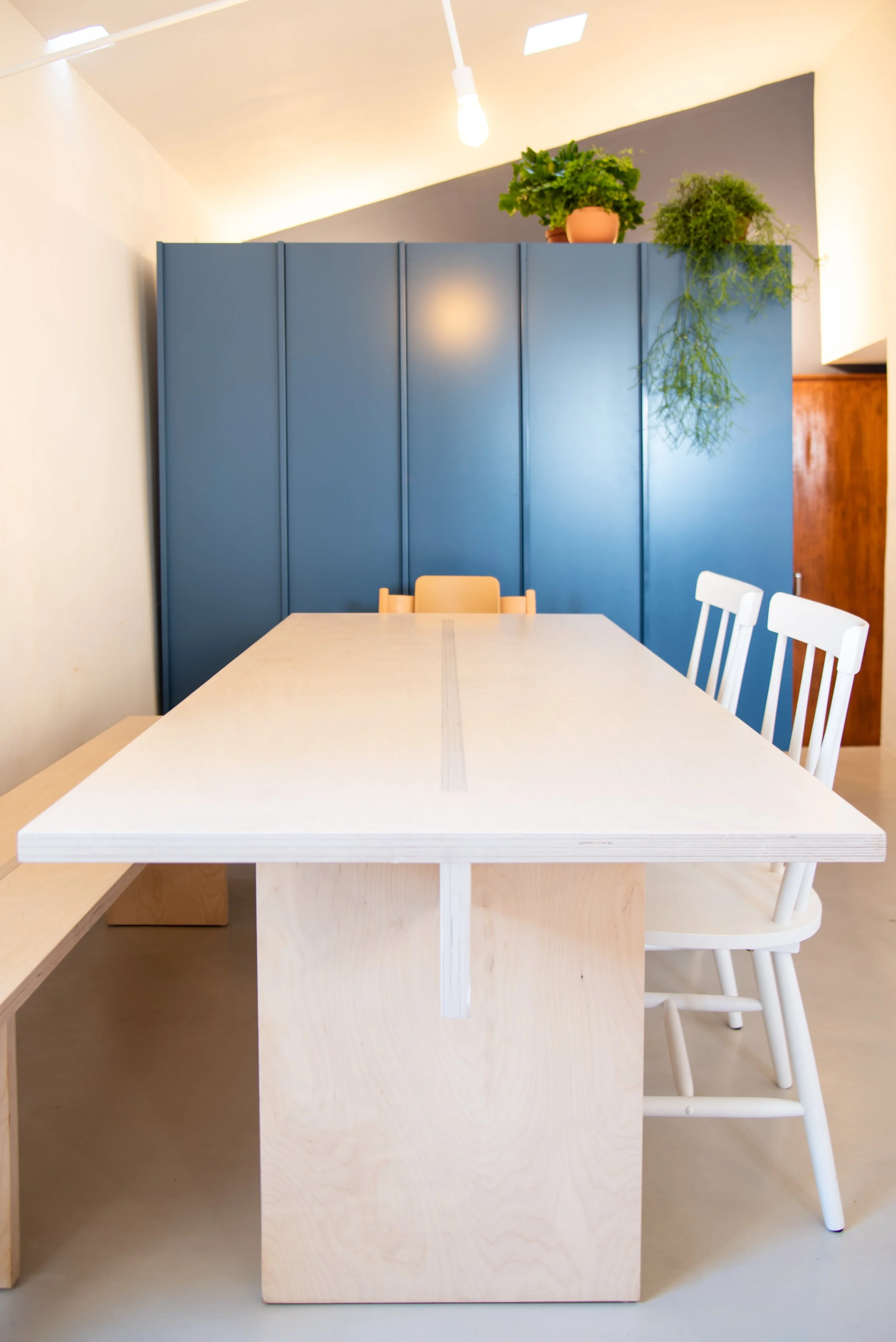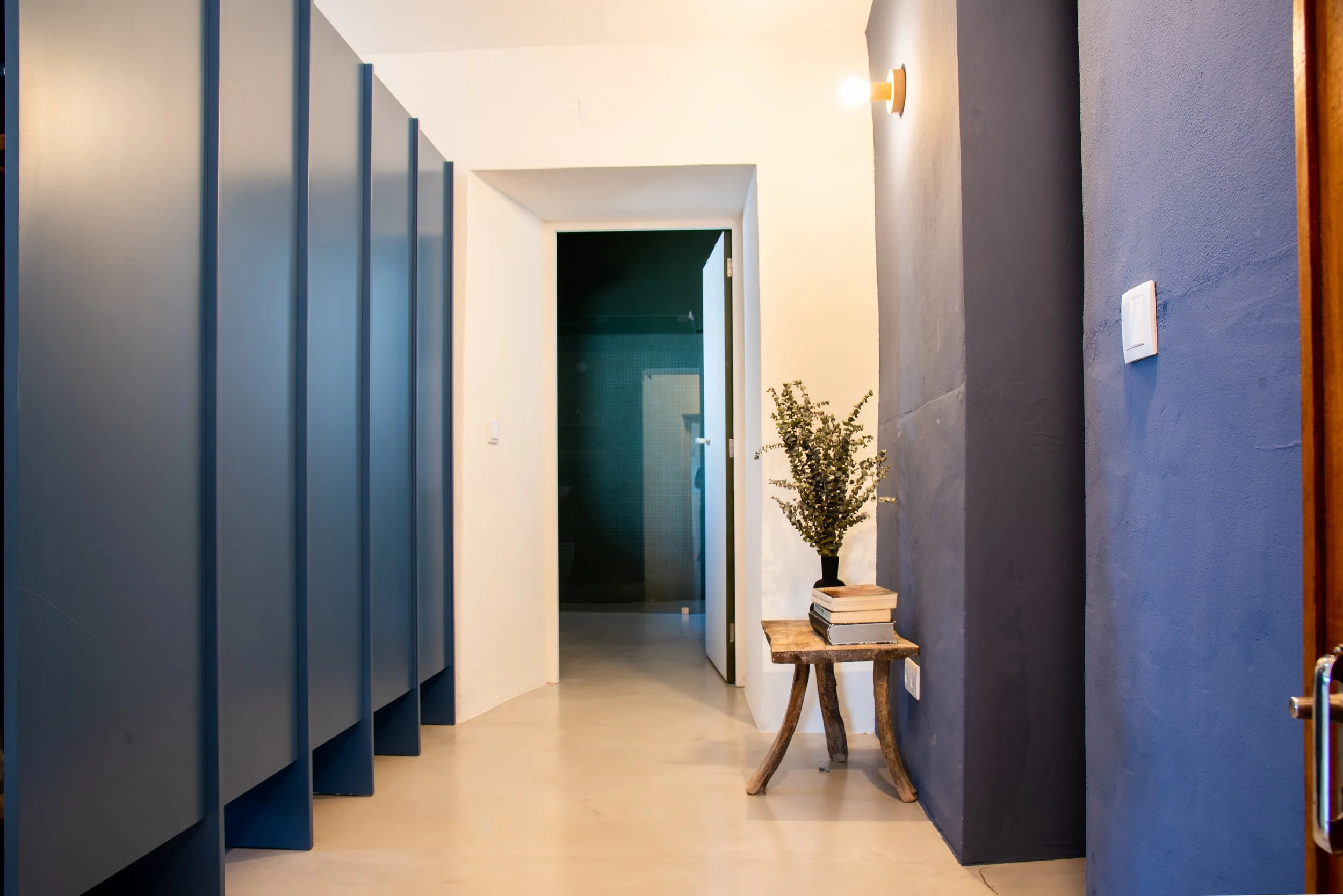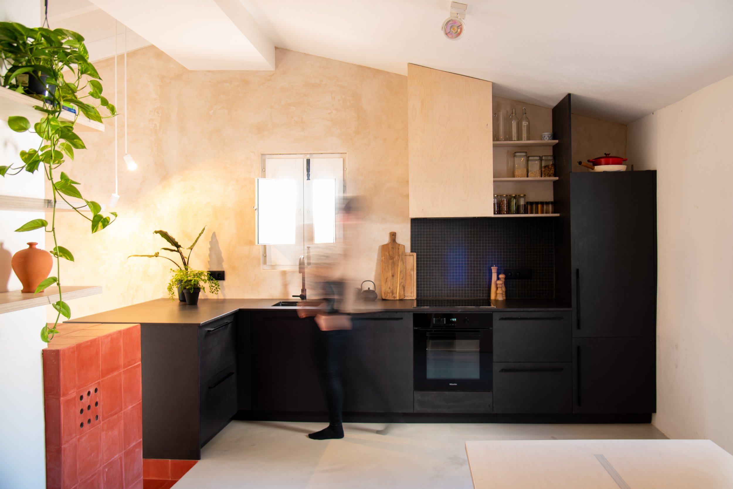 Optimizing 73 sqm to house a family of 6. A challenge that took us towards an exercise of exploring the heights and levels. Two mezzanines solve the sleeping niches for the kids, and free up the common area for a spacious gathering. All the carpentry elements are partitions and storage in one. Great care is taken in the selection of the materials, most from natural origin, creating a low impact building as well as a healthy interior. Furthermore some additional strategies were implemented, crucial for this particular geograpich location, namely rain water collection, a phytodepuration system for sewage water, deciduous plants for south shading, solar heating and power. Set in the hills of the Algarve, the colour scheme represents the soft tones of the surroundings, and some bright and fun accents give a refreshing and youthfull feel to the interior.