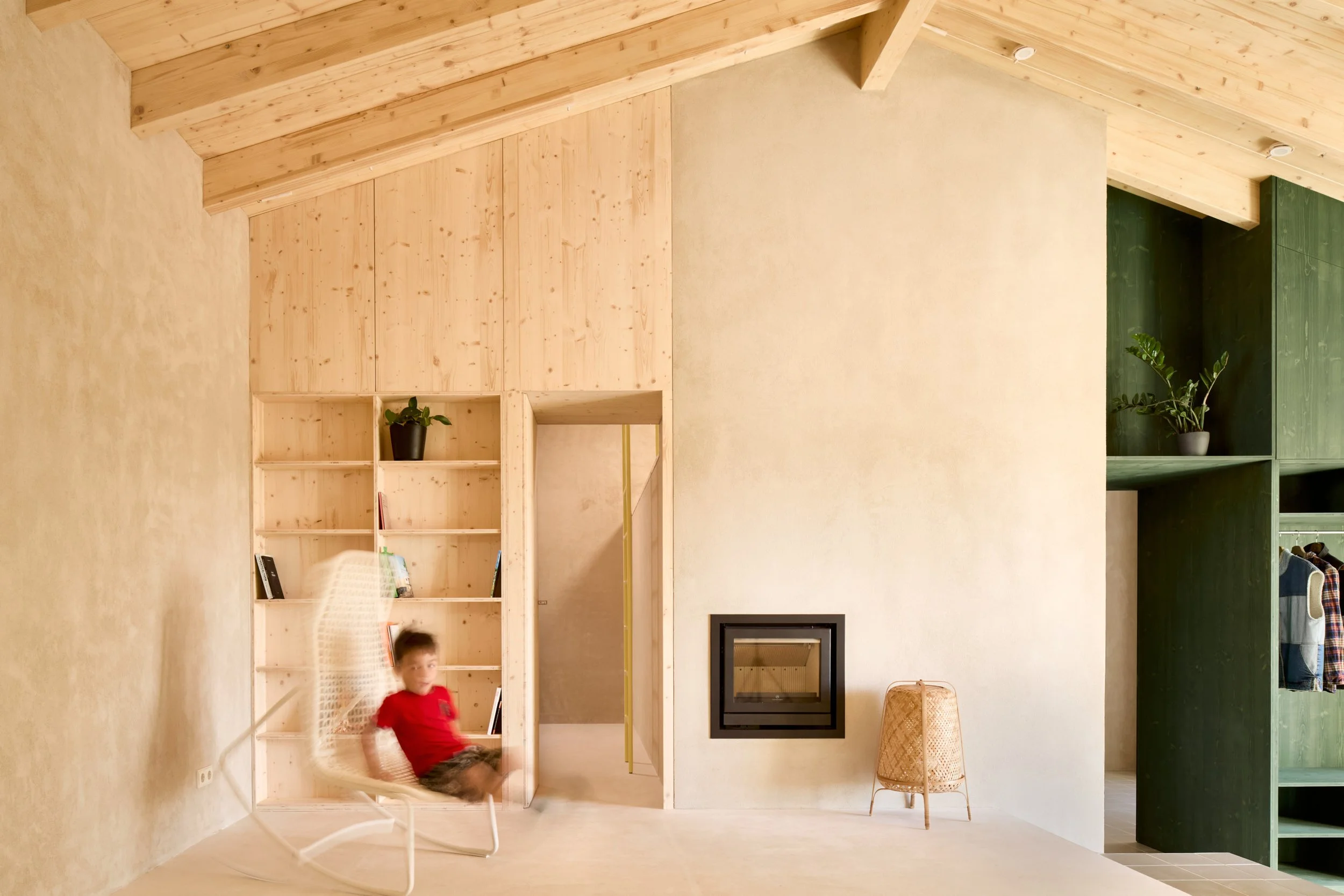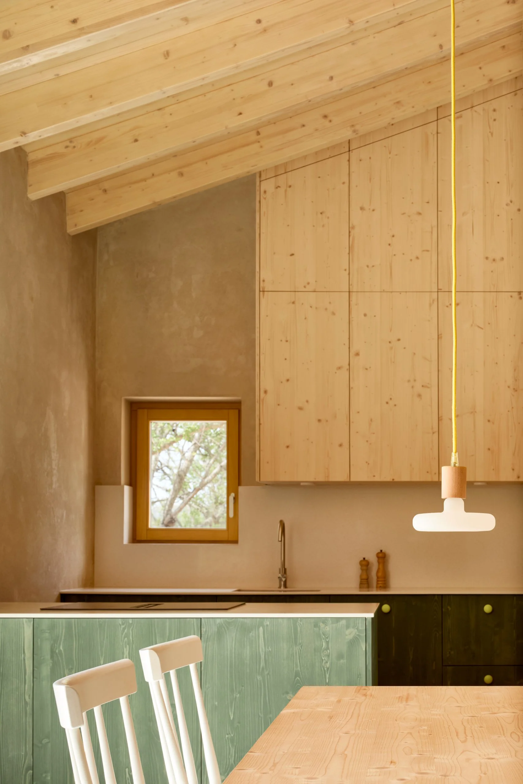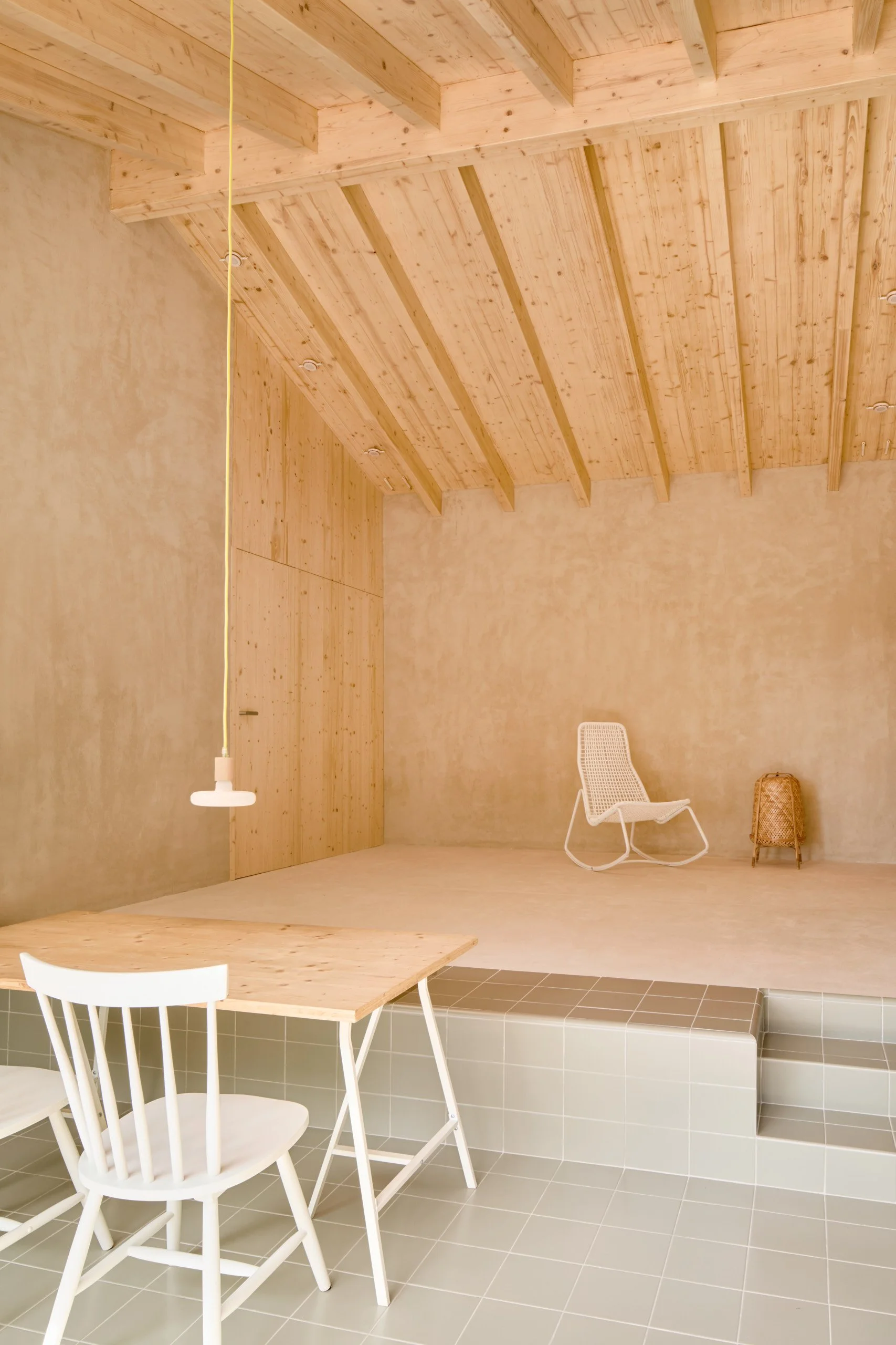 Optimizing 73 sqm to house a family of 6. A challenge that took us towards an exercise of exploring the heights and levels. Two mezzanines solve the sleeping niches for the kids, and free up the common area for a spacious gathering. All the carpentry elements are partitions and storage in one. Great care is taken in the selection of the materials, most from natural origin, creating a low impact building as well as a healthy interior. Furthermore some additional strategies were implemented, crucial for this particular geograpich location, namely rain water collection, a phytodepuration system for sewage water, deciduous plants for south shading, solar heating and power. Set in the hills of the Algarve, the colour scheme represents the soft tones of the surroundings, and some bright and fun accents give a refreshing and youthfull feel to the interior.