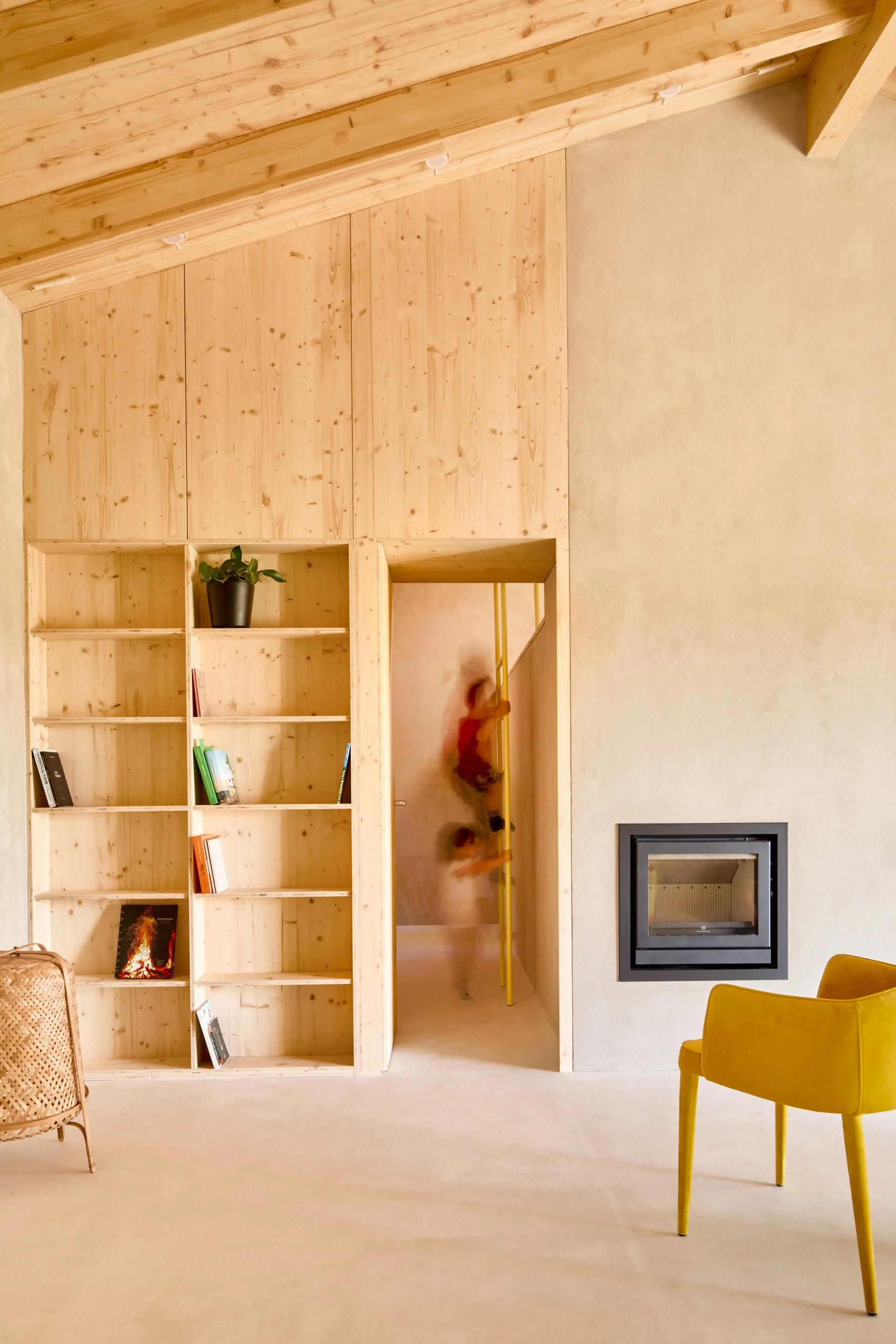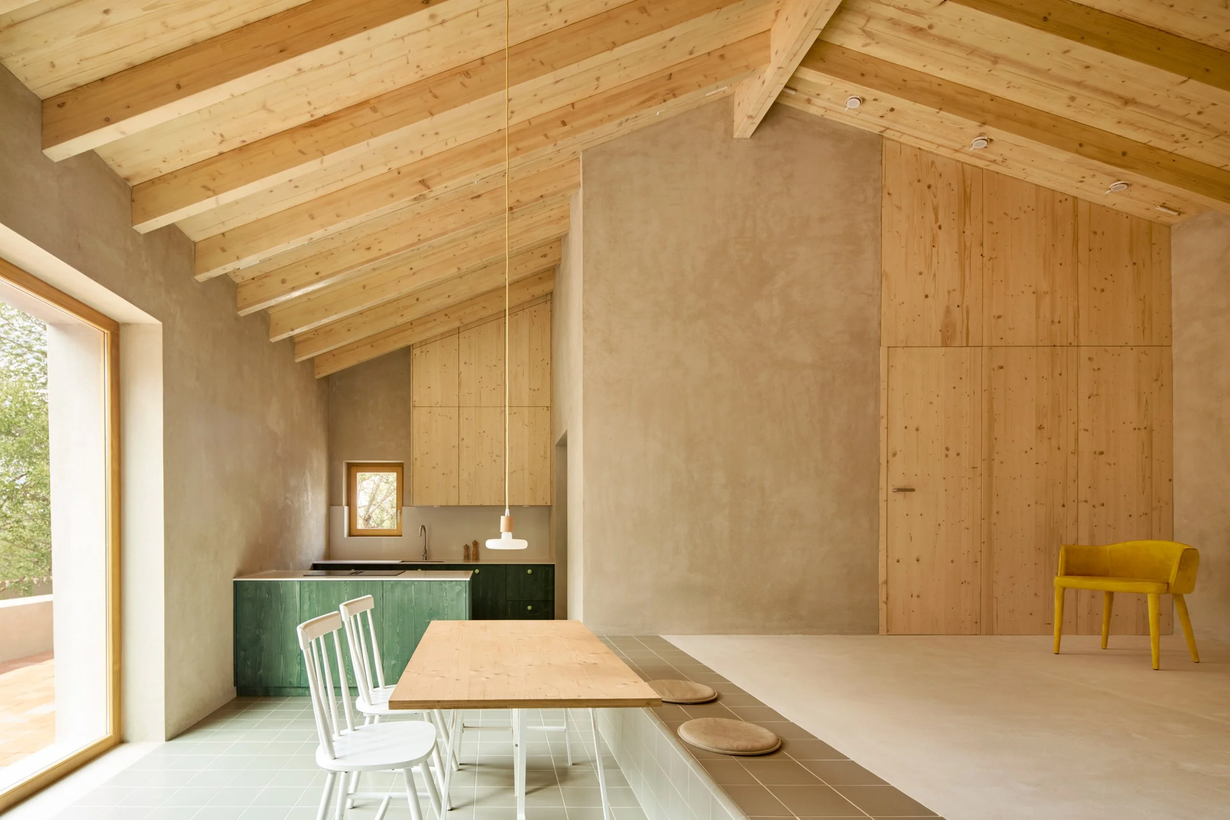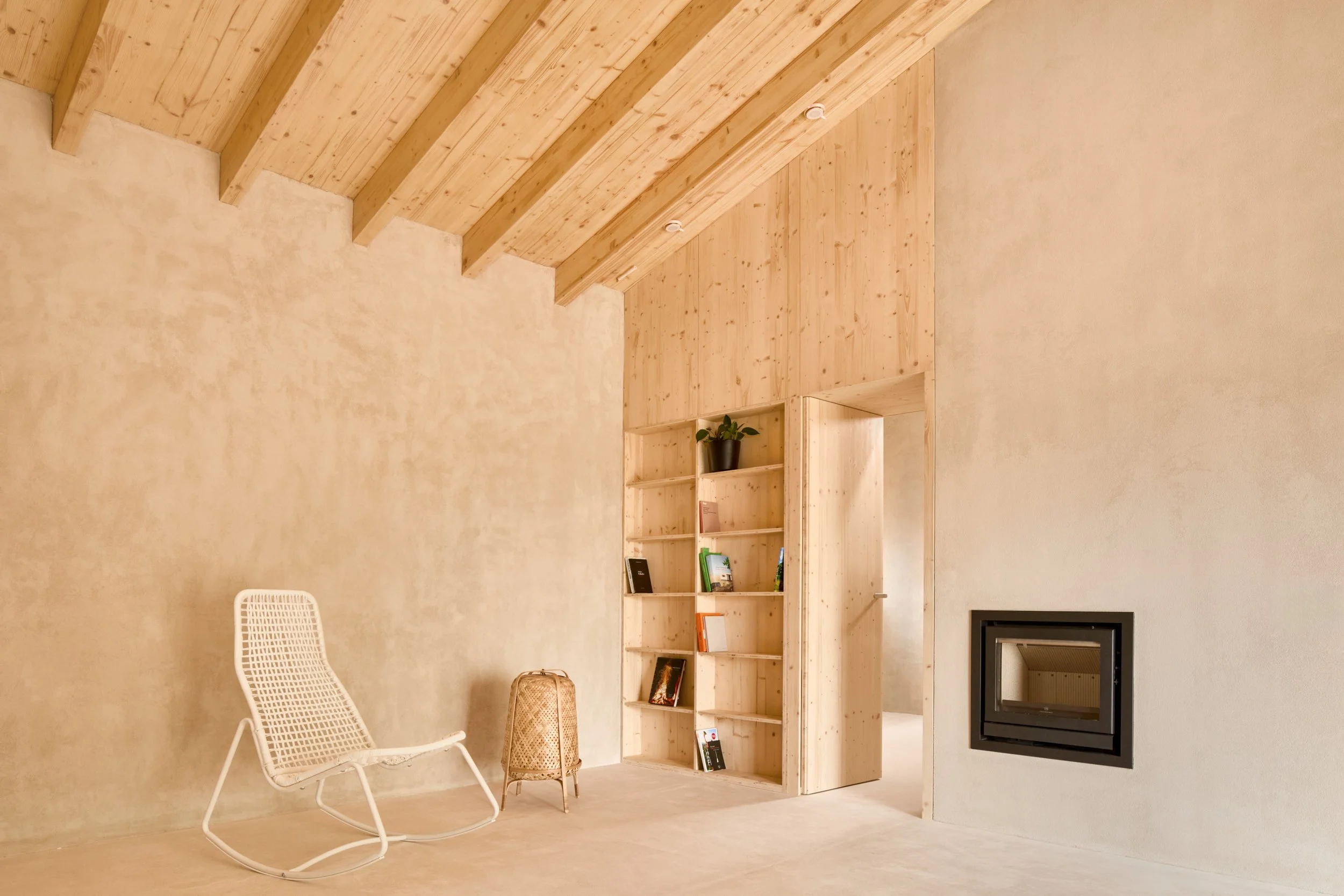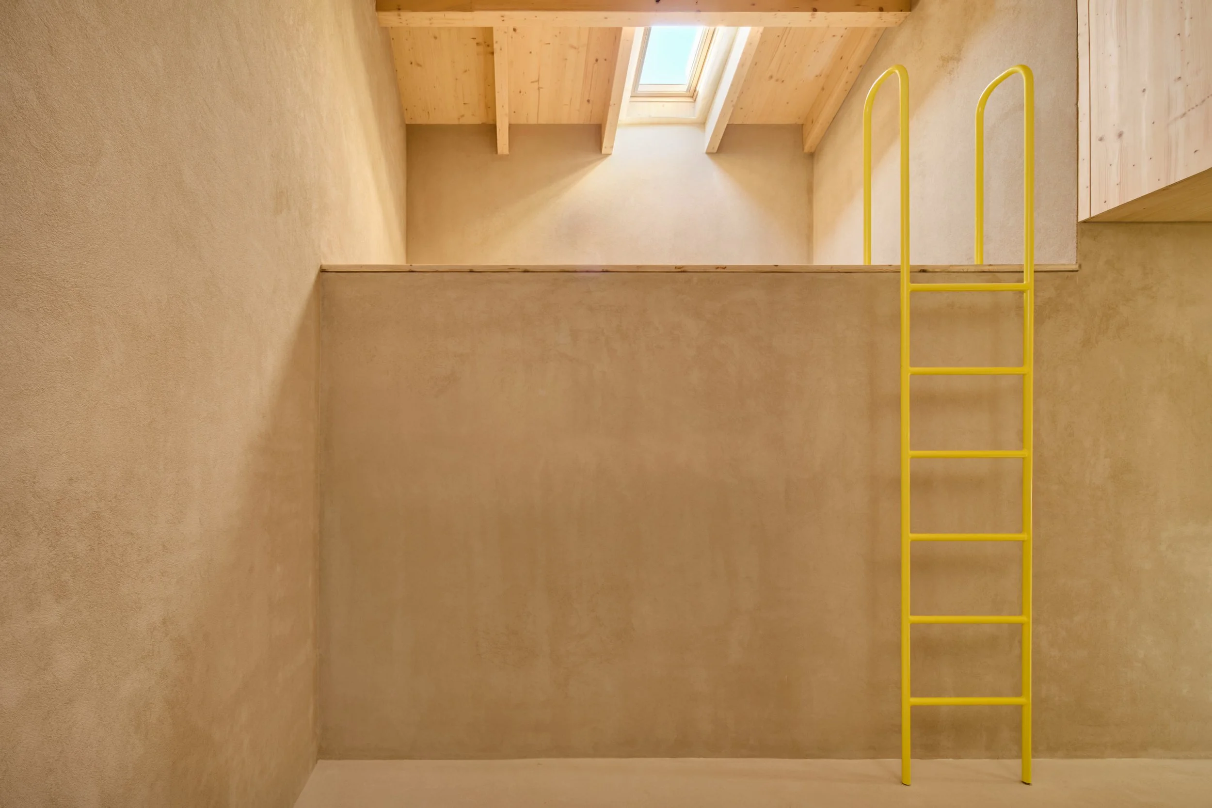 Optimizing 73 sqm to house a family of 6. A challenge that took us towards an exercise of exploring the heights and levels. Two mezzanines solve the sleeping niches for the kids, and free up the common area for a spacious gathering. All the carpentry elements are partitions and storage in one. Great care is taken in the selection of the materials, most from natural origin, creating a low impact building as well as a healthy interior. Furthermore some additional strategies were implemented, crucial for this particular geograpich location, namely rain water collection, a phytodepuration system for sewage water, deciduous plants for south shading, solar heating and power. Set in the hills of the Algarve, the colour scheme represents the soft tones of the surroundings, and some bright and fun accents give a refreshing and youthfull feel to the interior.